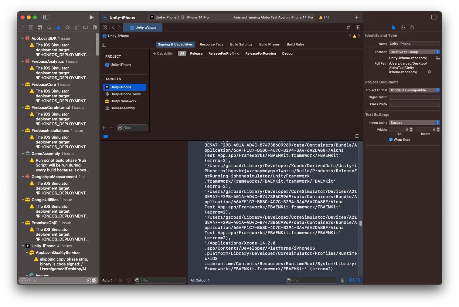 Unity에서 iOS용 프로젝트를 빌드 후 XCode에서 실행해보면 Facebook framework 를 읽지 못한다는 메시지가 노출되며 앱실행이 종료됩니다.
