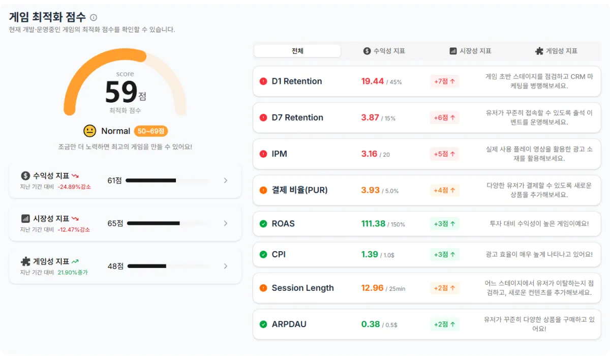 이러한 고민을 해결하기 위해, 모바일 게임에 특화된 퍼블리싱 어시스턴트 플라밍고는 핵심 지표를 점수로 환산하여 쉽게 우선순위를 결정할 수 있도록 도와드리고 있습니다. 알로하팩토리가 직접 모바일 게임을 런칭하며 의사결정을 진행했던 경험과 노하우를 바탕으로, 현재 게임이 시장에서 어느 정도의 성과를 보이고 있는지 보다 직관적으로 파악할 수 있죠.