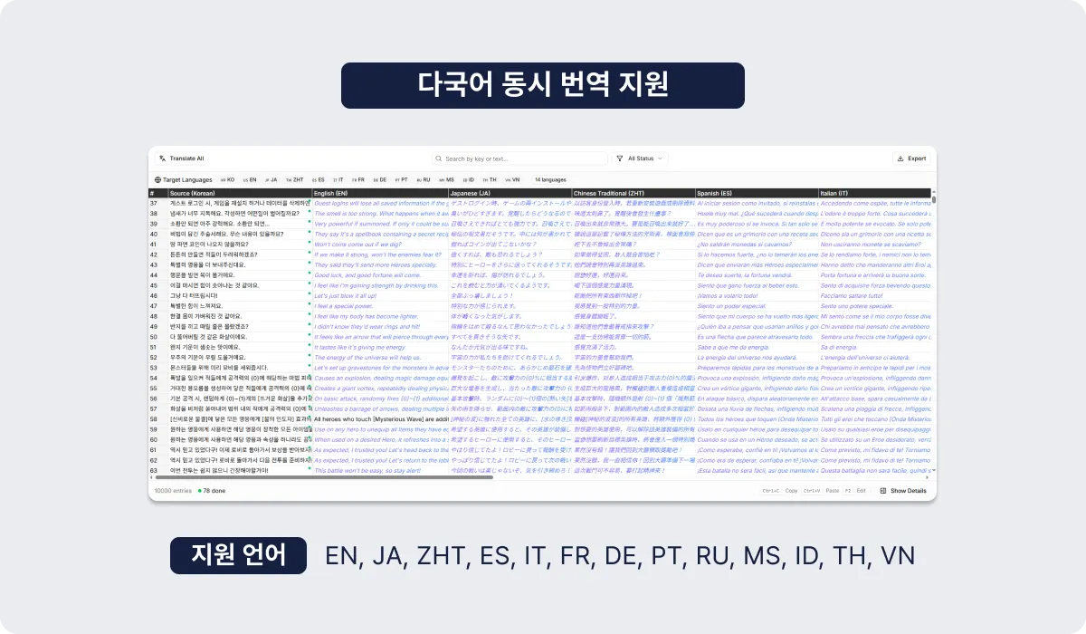 모바일 게임의 국가별 성과를 테스트 할 때, 마케팅 소재 뿐만 아니라 인게임 텍스트도 다양한 언어로 동시에 번역해야 하는 경우가 종종 발생합니다. 그러나 전문 번역가에게 여러가지 언어로 동시 번역을 맡기려면 시간과 비용이 증가하는 것은 물론, 다수의 번역가에게 동시에 의뢰해야 하는 경우가 많죠.