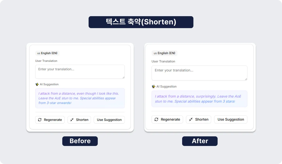 또한 같은 문장을 번역하더라도 사용하는 언어에 따라 글자수가 늘어나는 경우도 있기 때문에, 정해진 컴포넌트 사이즈에 맞게 번역을 진행하기 위해서는 언어별로 글자수를 줄이는 기능이 꼭 필요합니다. 이러한 이유로 플라밍고는 주요 13개 언어 모두 개별 축약(Shorten) 기능을 포함하게 되었답니다
