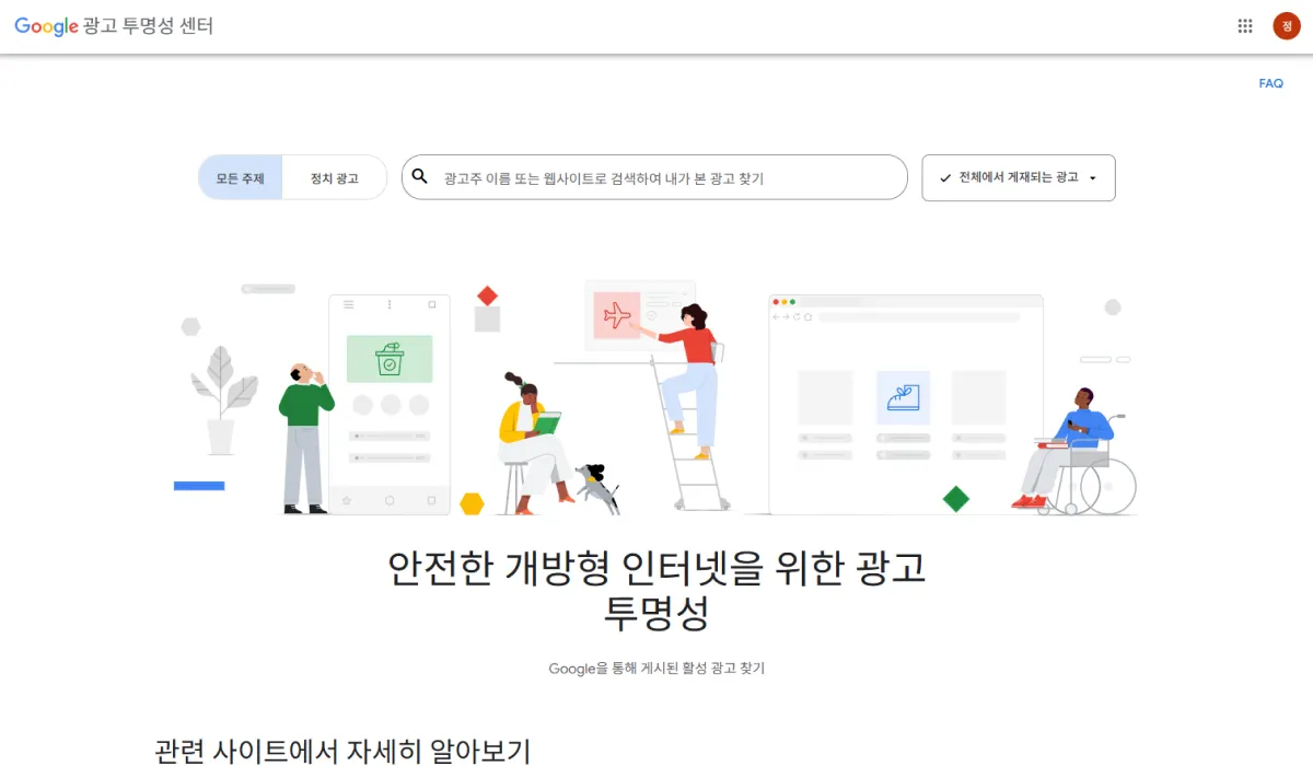 광고 투명성 센터는 Google Ads의 네트워크 지면과 Youtube 광고를 제공하는 라이브러리입니다. 메타 광고 라이브러리와 달리 별도의 키워드 검색을 지원하지 않으며 특정 광고주명을 입력해야 해당 광고주의 광고를 모아서 제공하는 구조여서 다소 사용하기 어려울 수 있으나, 현재 영상 광고 중 가장 파급력이 큰 매체중 하나인 Youtube 집행 광고를 모아볼 수 있어 두 번째로 자주 사용되는 라이브러리 서비스이기도 합니다.