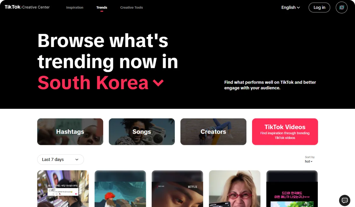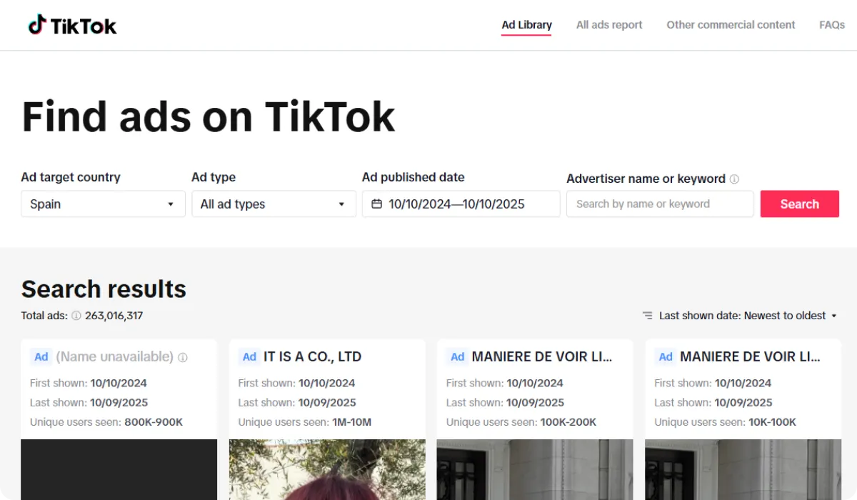 반면, 애드 라이브러리는 틱톡에서 운영하는 광고의 인사이트를 제공합니다. 특정 국가를 선택할 수 있으며 키워드 검색을 지원하여 보다 다양한 주제를 직접 선택하여 찾아볼 수 있고, 대략적인 노출량을 표기하여 특정 광고의 성과를 유추할 수 있다는 장점이 있죠. 그러나 국내에서 다소 비중이 작은 만큼, 국내 광고 라이브러리는 제공하지 않는다는 단점이 있습니다.