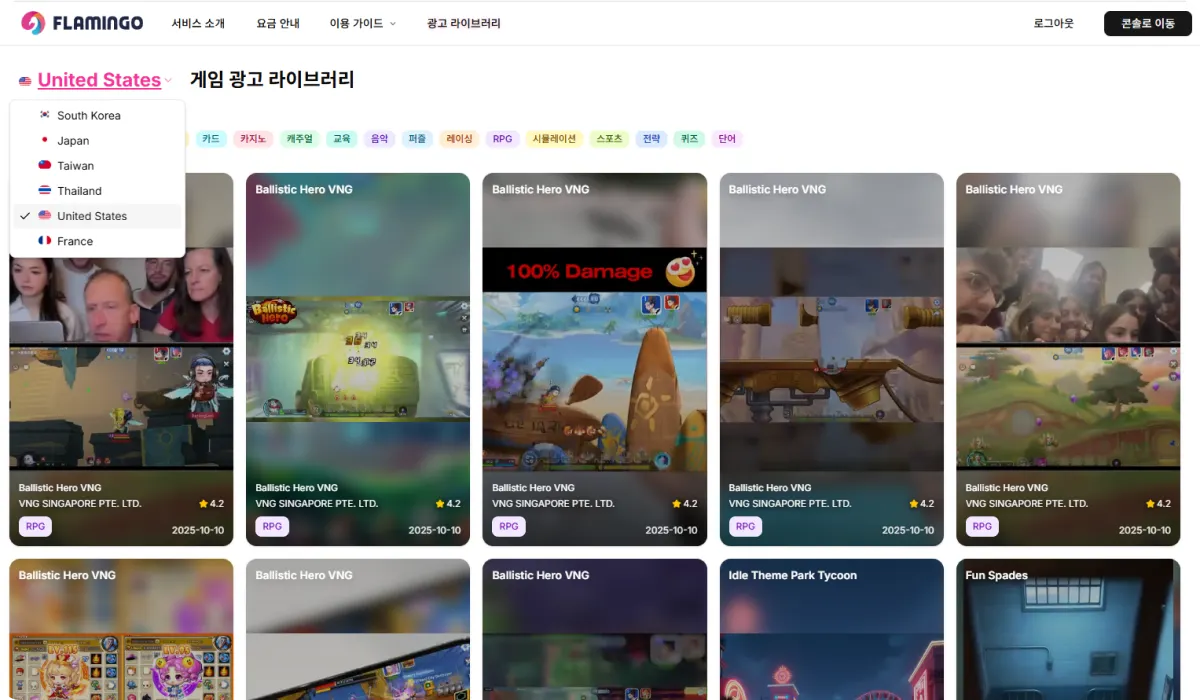 즉, 플라밍고 게임 광고 라이브러리는 “다른 나라에서는 내 게임과 비슷한 장르의 게임을 어떻게 광고하는지”를 보다 명확하게 확인할 수 있습니다.