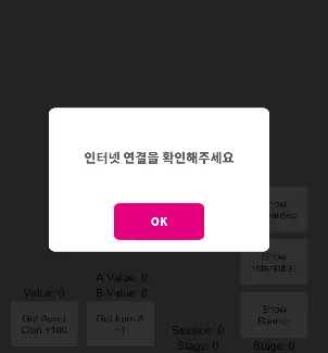 오프라인 상태일 경우, 다음 팝업이 뜨며 유저에게 인터넷 연결을 요청합니다. OK를 누르면 오프라인 여부를 다시 체크하고, 여전히 오프라인이면 다시 팝업을 띄웁니다.
