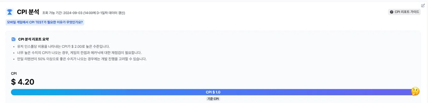 CPI 분석: 모바일 게임의 대중성을 측정할 수 있는 CPI 분석 리포트를 제공합니다.