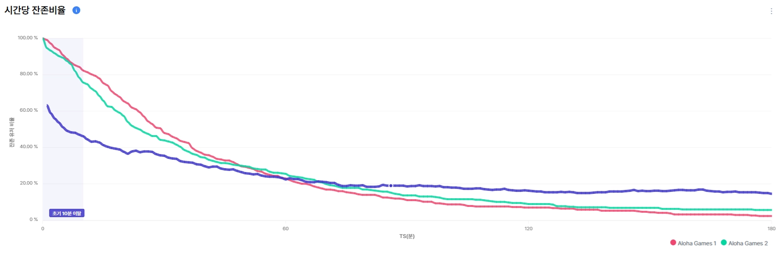 시간당 잔존 비율 분석: 유저가 초기에 이탈하는 지점을 레퍼런스 데이터와 비교하여 분석합니다.