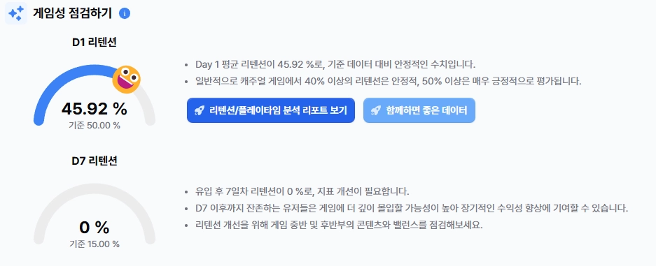 - 게임성: D1과 D7 리텐션 지표를 기준으로 게임의 초기 안착과 지속 가능성을 분석합니다.