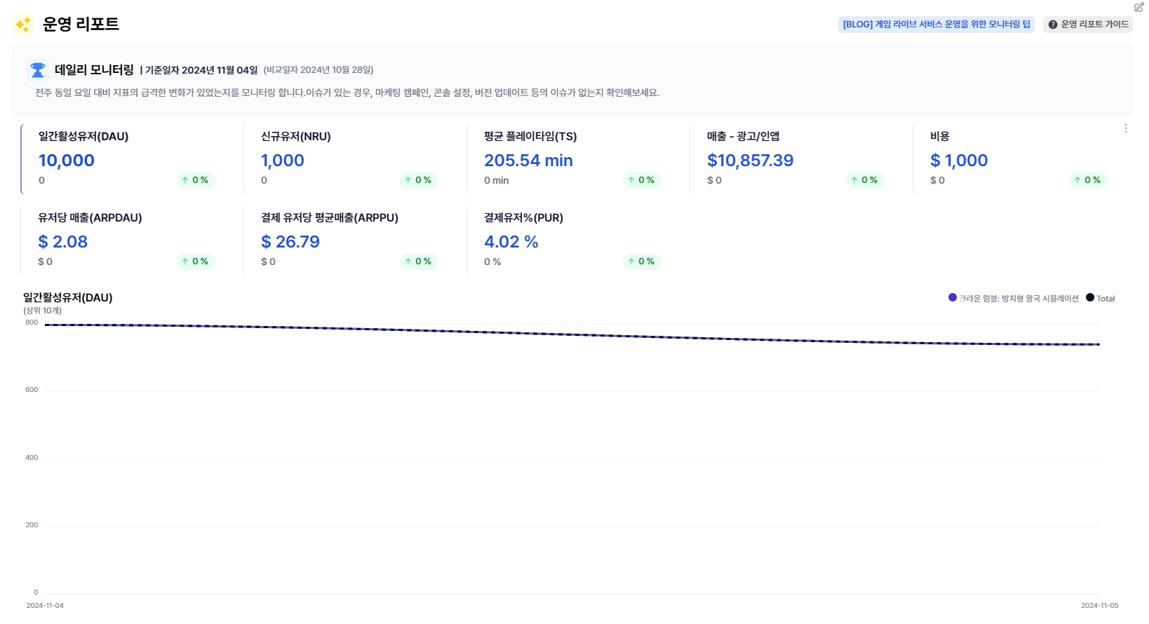 게임의 현재 상태를 한눈에 파악할 수 있도록, 필수적인 개발 및 운영 지표와 인사이트를 제공합니다.
