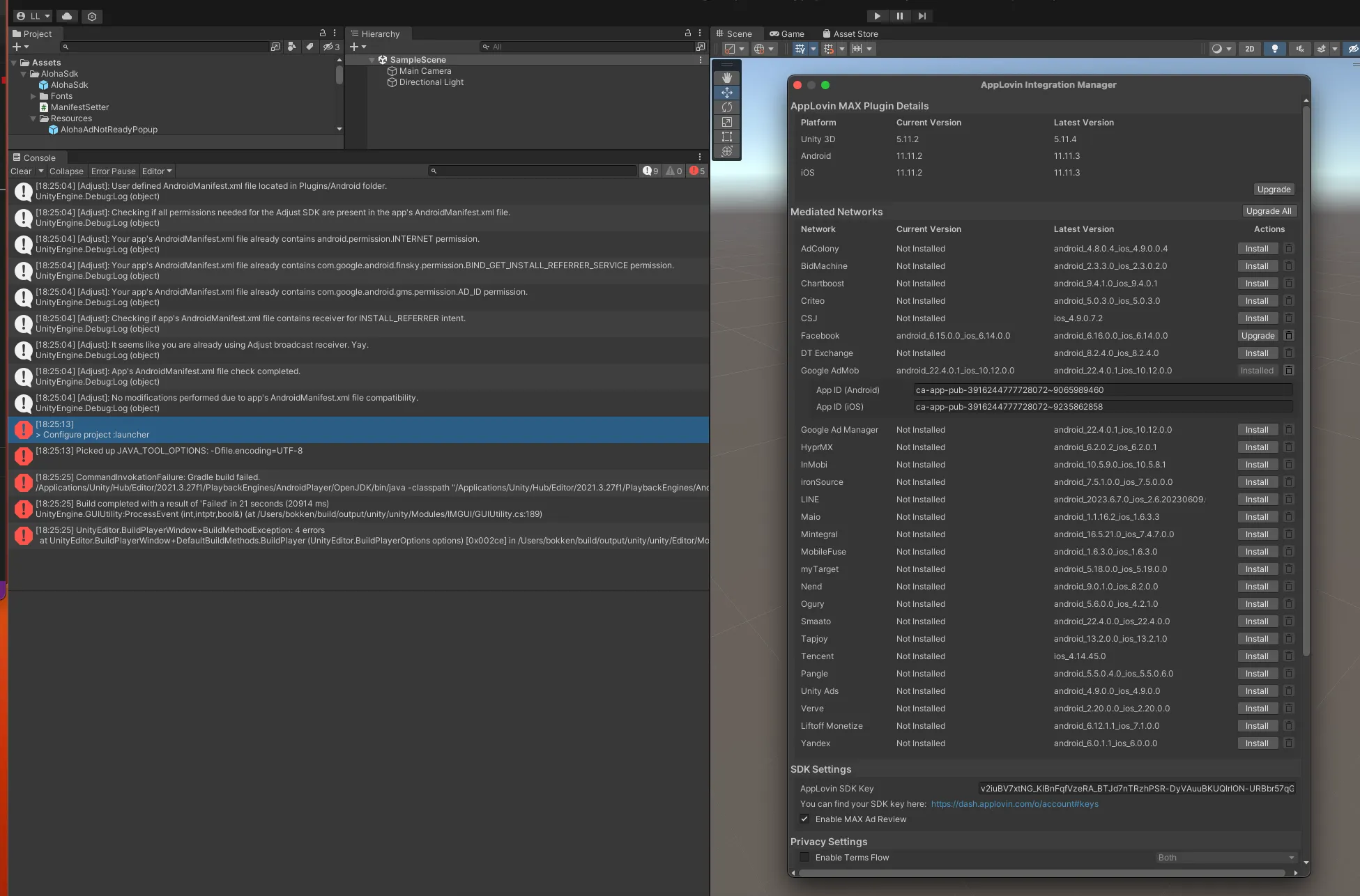 Applovin Integration Manager에서 Google App Id를 정상적으로 설정하지 않을 경우, 빌드가 되지 않거나 게임 실행 직후 크래시가 날 수 있습니다.