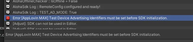 에디터에서 [AppLovin MAX] Test Device… 오류가 계속 떠요