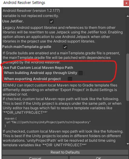 모든 옵션을 체크 해제하고, Assets/Plugins/Android 아래의 해당 파일을 삭제하고 다시 해당 필요한 설정을 선택하면 Unity와 Android의 설정에 맞춰서 다시 생성됩니다. (Gradle, Manifest 설정버전이 변경)