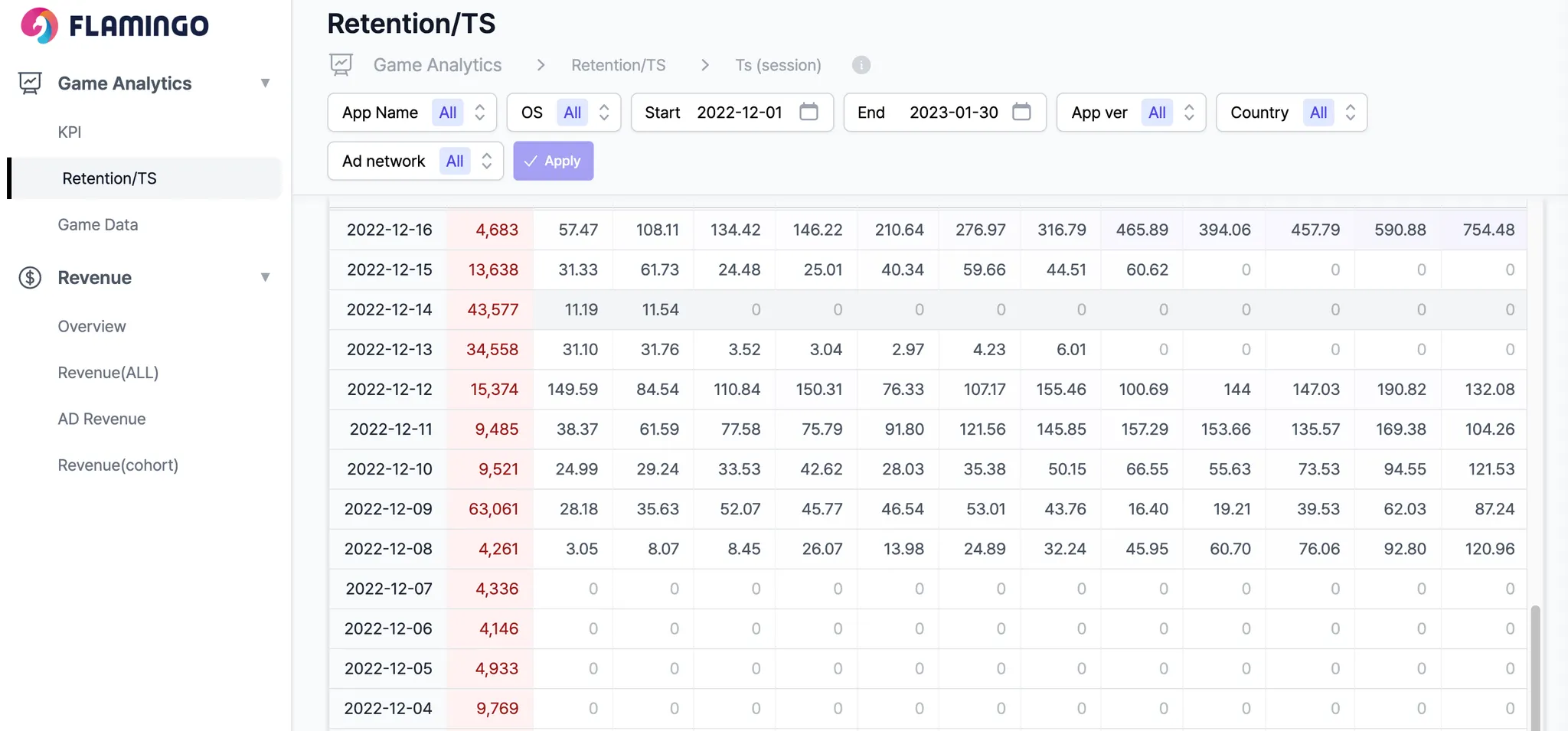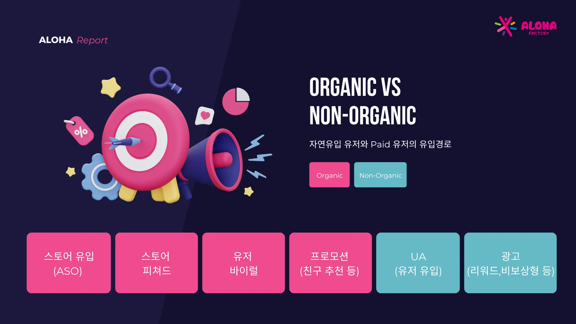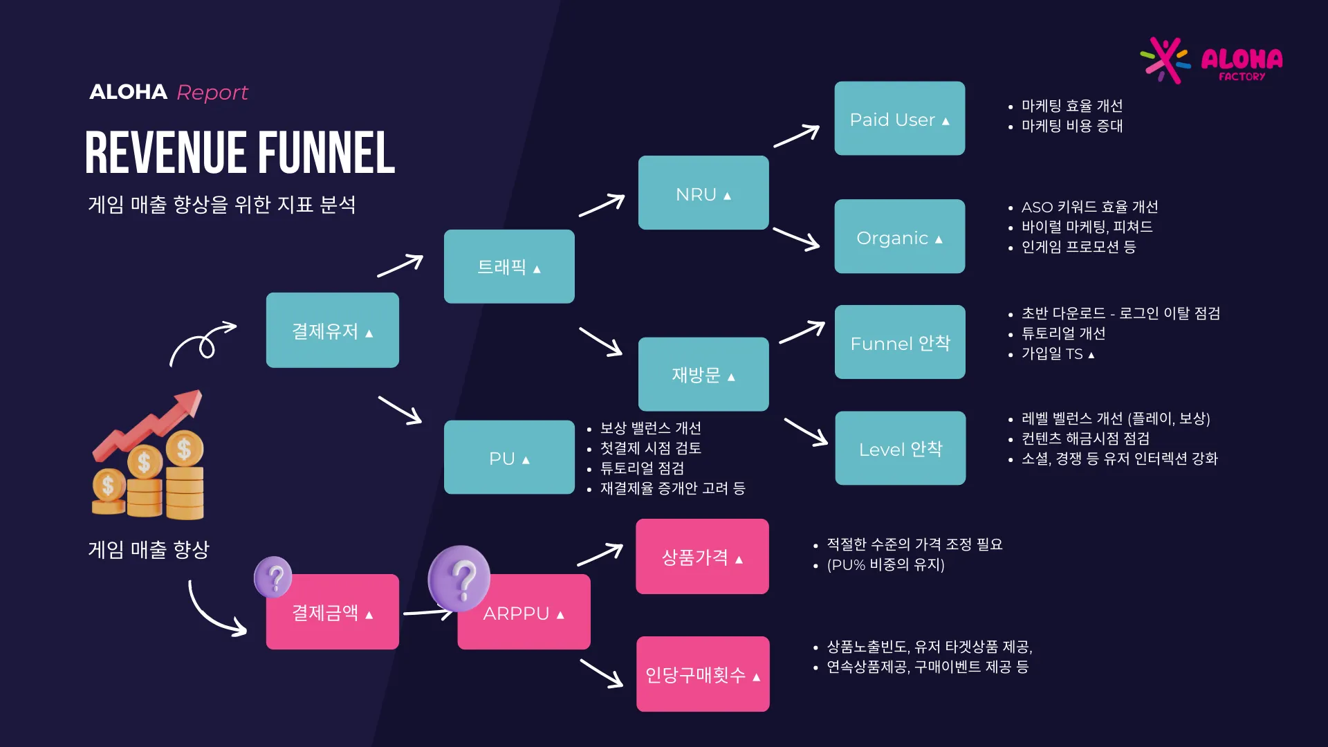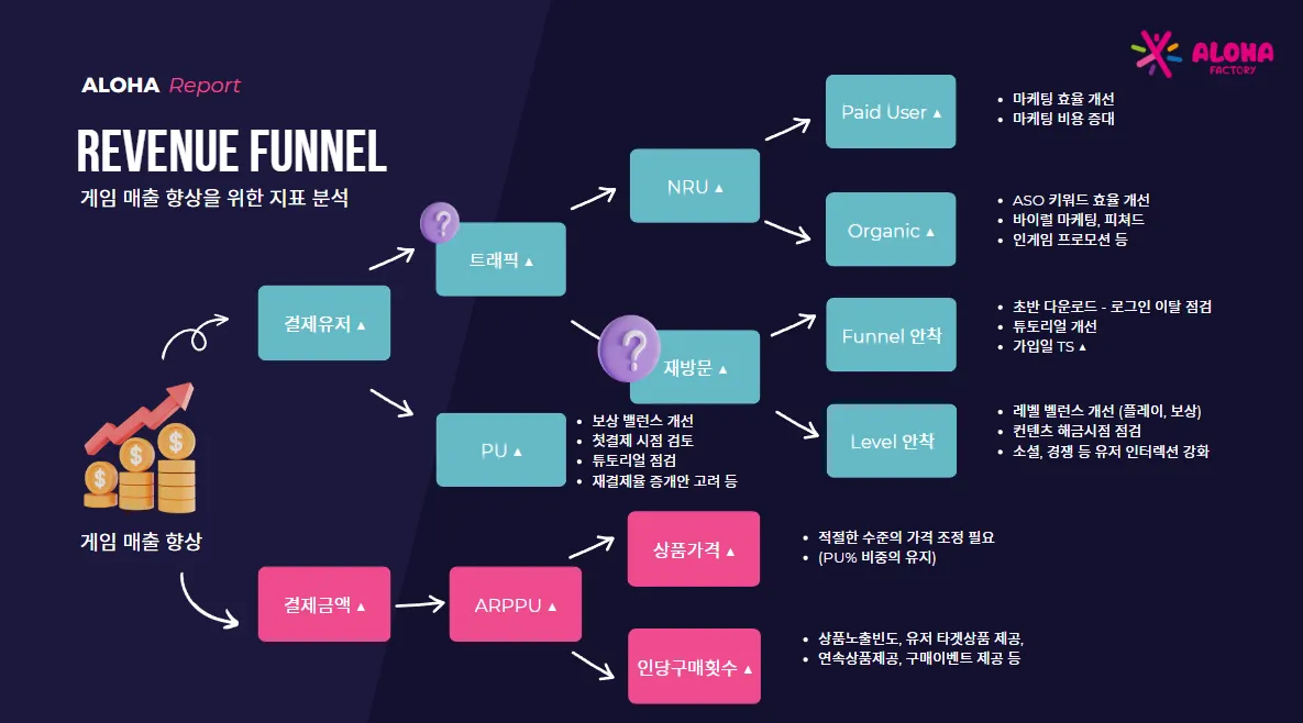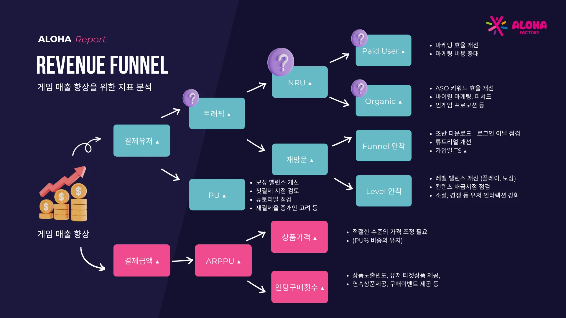Basic data such as marketing CPI test results, retention, TS, etc. can be found through the Flamingo service I introduced earlier. In addition, Aloha Factory's data team analyzes more granular data specific to your game and draws insights into what you need to improve in your game.