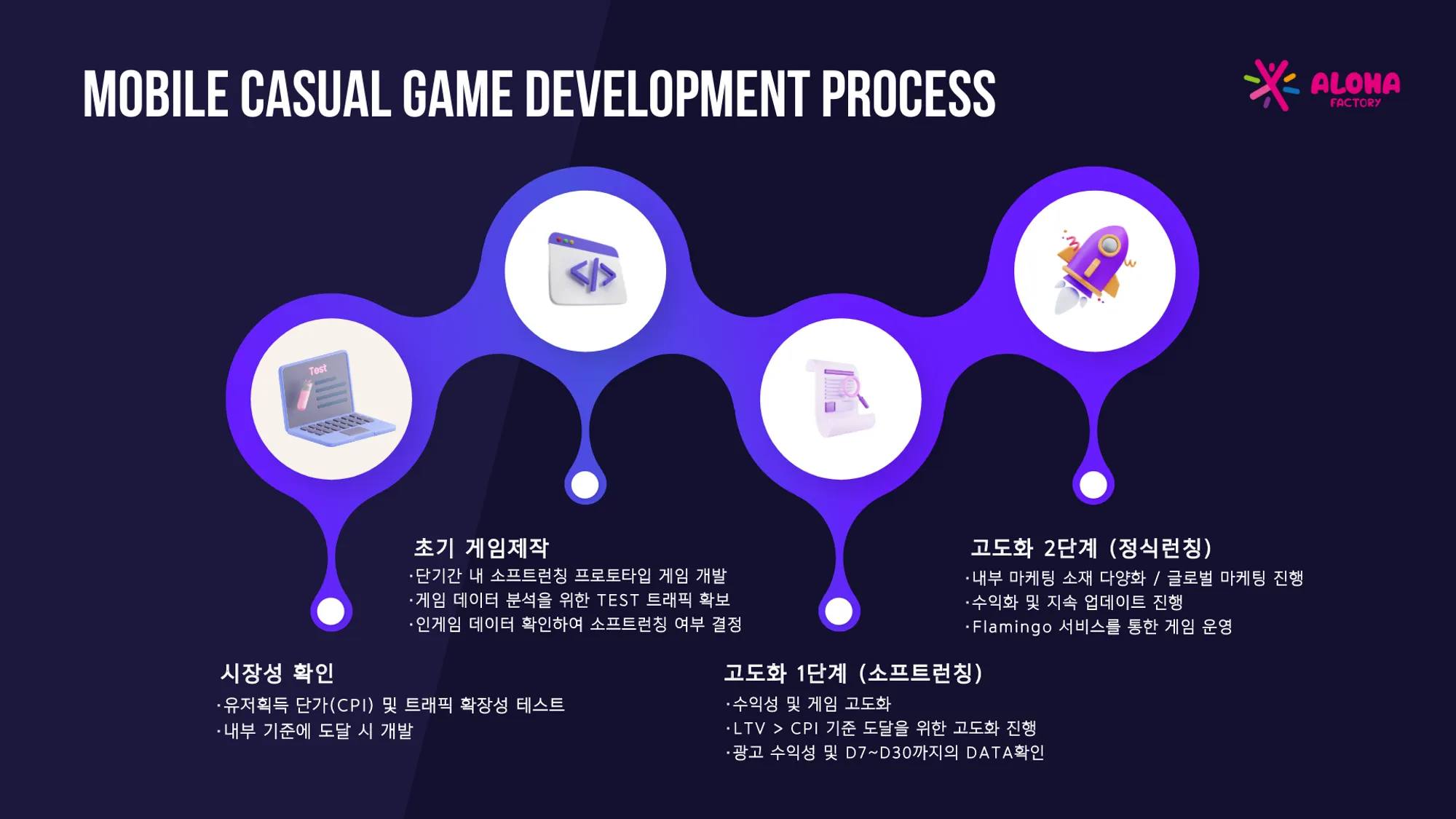 Aloha Factory's game production process is divided into stages: Marketability Test (S1-S2) -> Gameplay and Profitability Test (S3) -> Launching and Scaling Up (S4) -> Operational Stage (S5). Even within this value chain, the game production process is further subdivided. As shown in the process below, we focus on each stage to confirm KPIs, analyze data, and prepare for the next stage. For Aloha Factory's production process case study, please refer to the previous post!