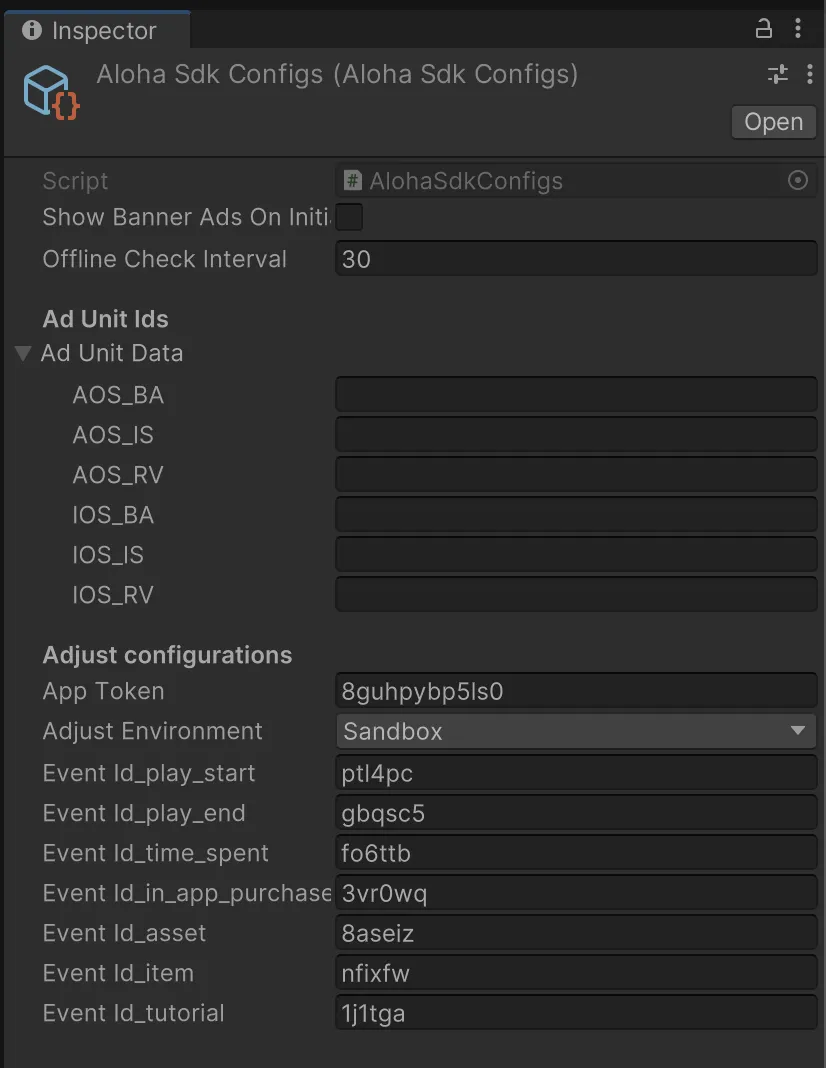 Assets/AlohaSdk/Resources 폴더에 있는 AlohaSdkConfigs를 설정합니다.