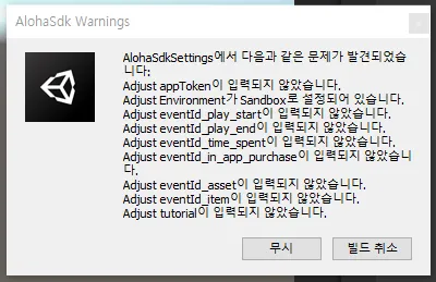AlohaSdkConfig의 값들이 적절하게 입력되지 않았을 경우 다음과 같은 경고창이 뜹니다.