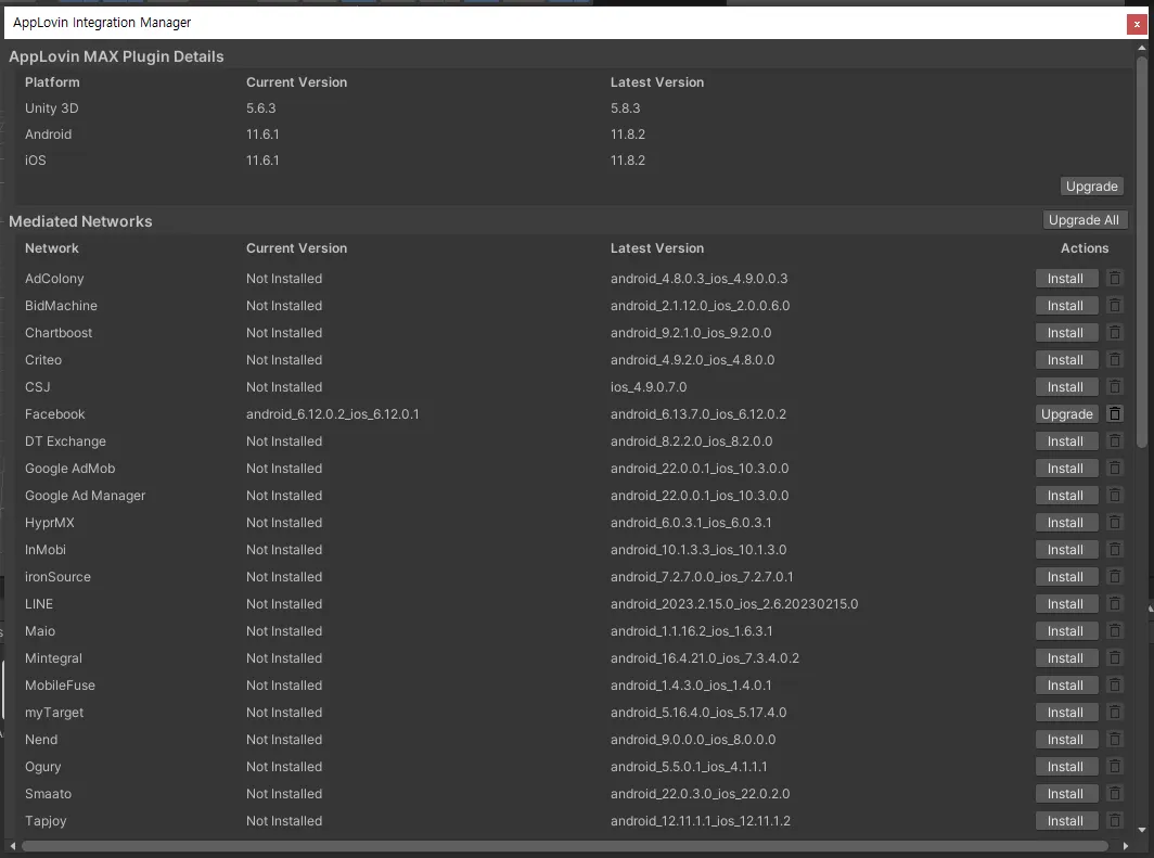 2) Applovin에서 mediation으로 사용하고자 하는 네트워크의 install