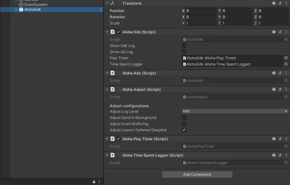 3) AlohaSdk 프리팹을 첫 Scene 에 추가
