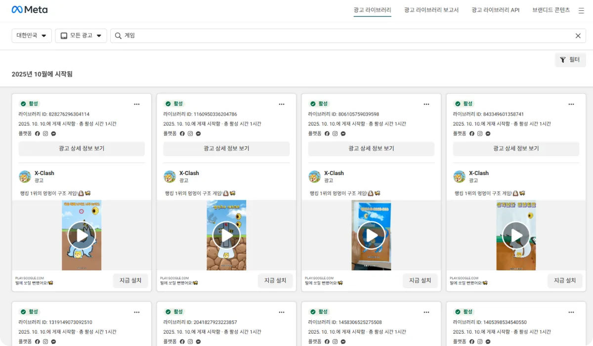 Meta, Google, Tiktok 등 다양한 광고 매체에서 라이브러리 서비스를 제공하고 있지만 게임 광고를 확인하기엔 여러모로 불편한 점이 많았습니다. 특히 다양한 광고와 광고주의 정보를 확인할 수 있지만, 대부분의 라이브러리 서비스는 특정 카테고리의 광고만 모아서 볼 수 있는 필터링 기능이 없거나 특정 광고주명을 알아야 하는 불편함이 있었죠. 그러나 광고 매체사에서 직접 제공하는 라이브러리 서비스인 만큼, 정확도가 가장 높다는 점은 뚜렷한 장점입니다.