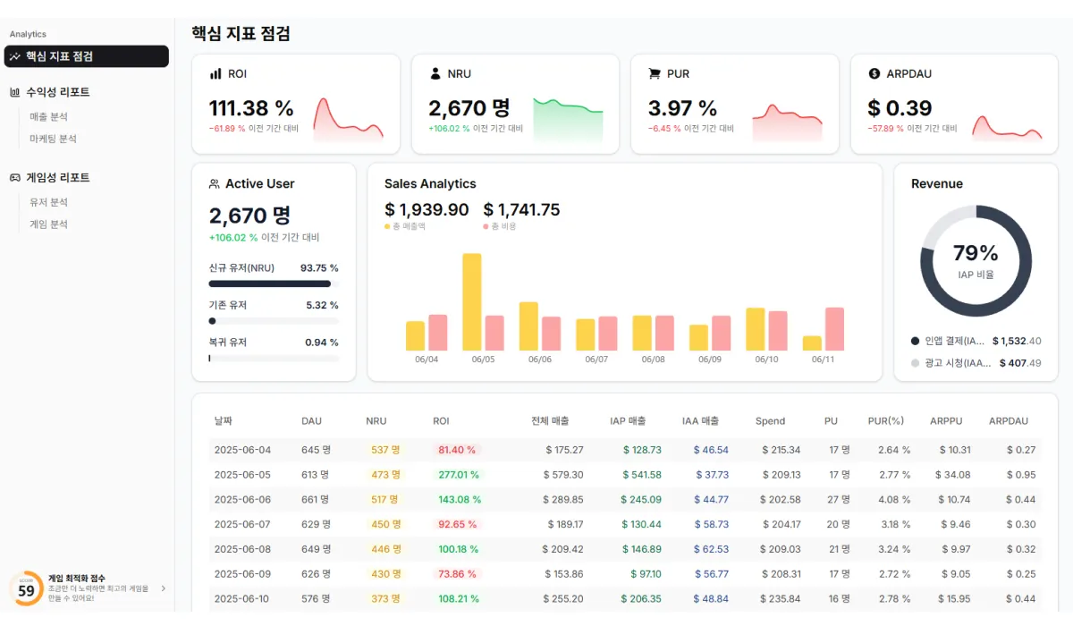 게임 출시 초기에 데이터를 분석하는 주된 목적은 “이 게임이 비용(마케팅)을 투자할만한 가치가 있는가?”를 검증하는 것입니다. 모바일 게임은 일부 서버 · 인프라 비용을 제외하면, 대다수의 비용이 마케팅으로 소진되기 때문에 다른 산업보다 ROAS, ROI에 더욱 민감한 편이죠. 더불어 일회성 구매가 아니라 사용자의 LTV(Lifetime Value)에 따라 수익이 크게 변하는 구조 때문에, 장기적인 관점의 BM 설계가 필수적입니다.