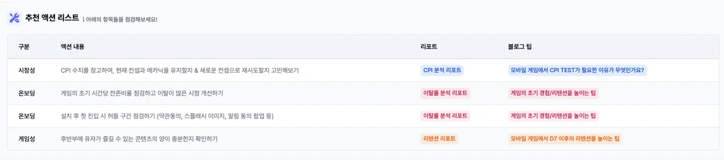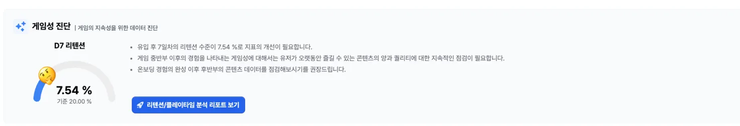 각 리포트에 대한 기준 지표 기반의 인사이트 및 가이드 제시를 통해, 게임 데이터에 대한 기반 지식이 없더라도 리포트의 내용을 통해 인사이트를 획득하실 수 있습니다.