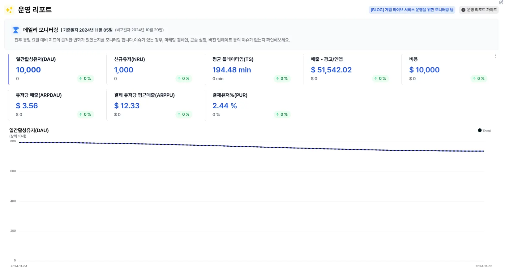 운영 진단: 운영 단계에서는 수익성 및 AU(Active Users)를 중심으로 게임이 안정적으로 운영되고 있는지를 확인하고, 운영 리포트를 통해 데일리 모니터링을 진행할 수 있습니다.