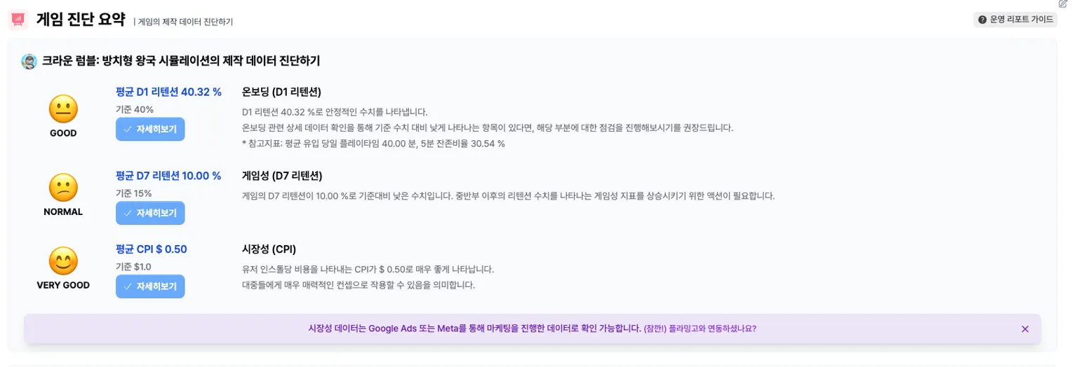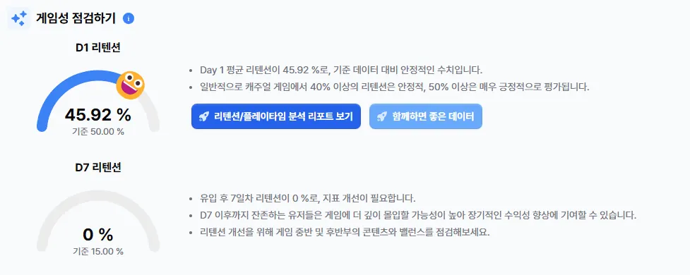 제작 진단: 게임의 시장성, 온보딩, 게임성에 대하여 핵심 지표를 기준으로 진단하고, 레퍼런스 데이터를 기반으로 가이드를 제공합니다.