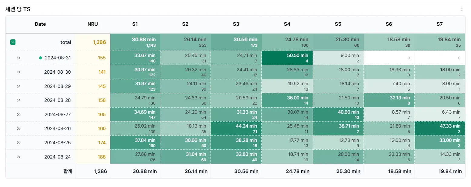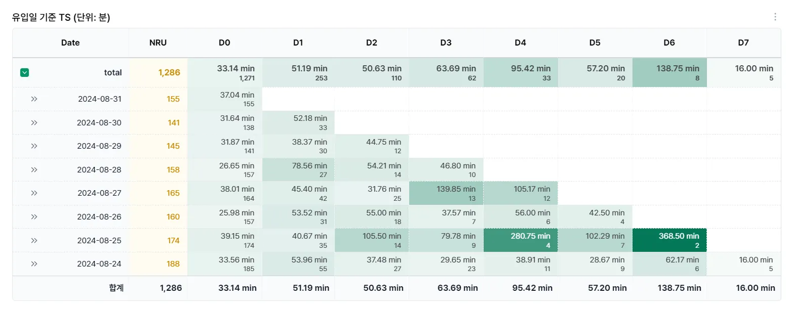 게임의 지속가능성을 판단하는 지표로 D7 리텐션을 기준으로 합니다.